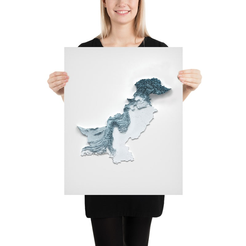 This is a minimalist topographical relief map of Pakistan, created by The Unique Maps Co. and elevated with our Unique 3D process. There are no labels, no roads, and no towns — just the land itself. Subtle highlights lift the highest summits outward while soft shadows settle into deep valleys and basins, revealing the country’s dramatic sweep from high Asian ranges to river plains and the sea.