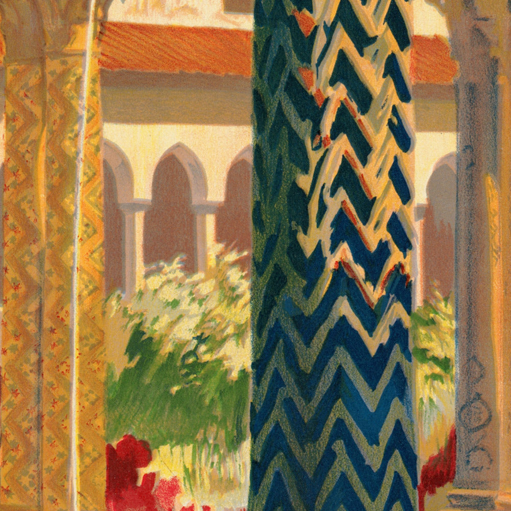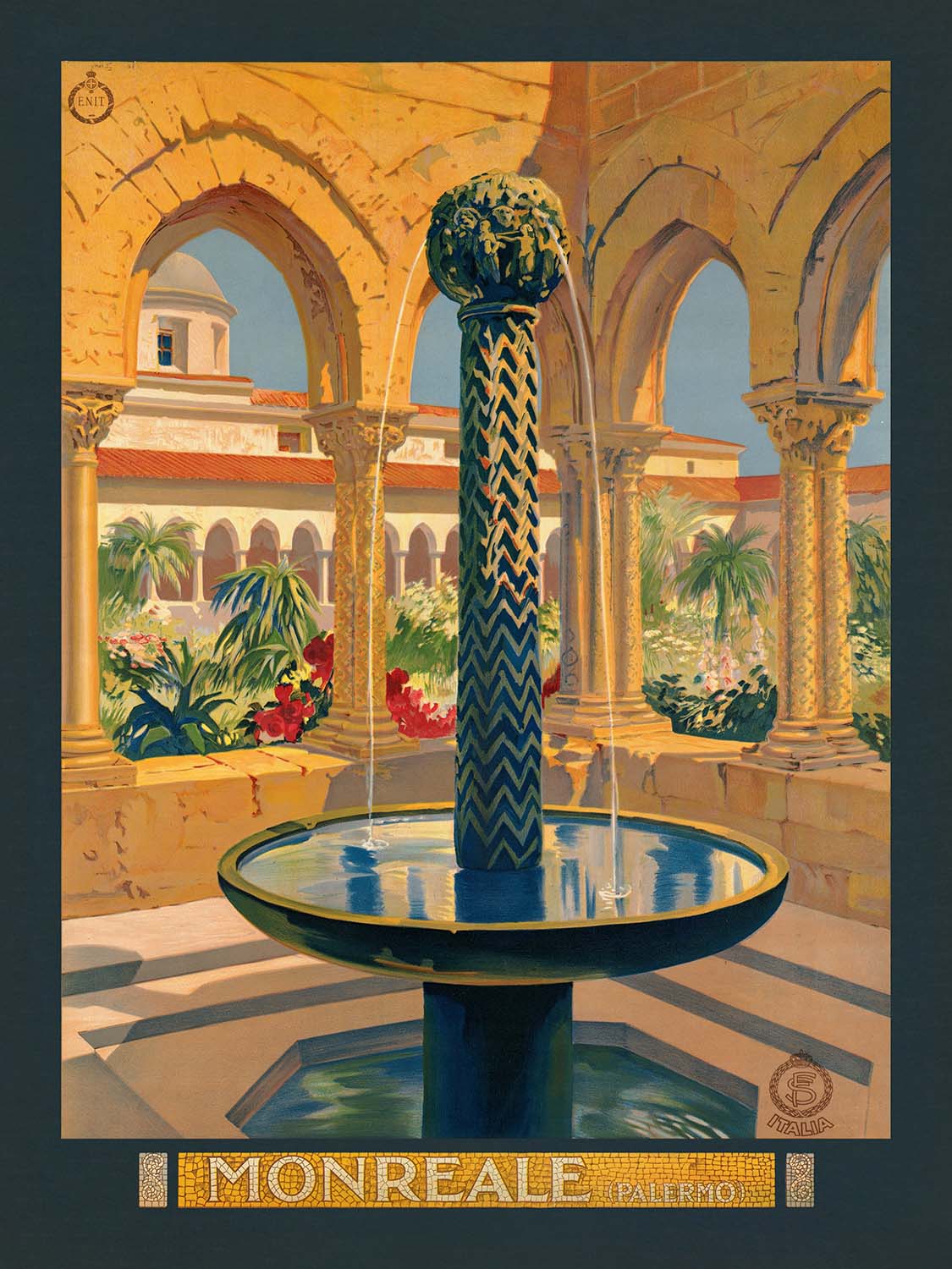 Monreale (Palermo) is a luminous Italian Art Deco travel poster celebrating the cloister of Monreale Cathedral, just outside Palermo in Sicily. The original artist is unknown—one of the many skilled illustrators and lithographers who helped define Italy’s early-20th-century travel aesthetic. Here, the timeless arches and a central fountain frame a cool, cloistered garden, inviting viewers to linger in a space where Mediterranean nature and medieval architecture meet. With its polished, modern illustration style applied to an ancient setting, the artwork captures the romance of Sicilian travel at the height of Europe’s poster age.