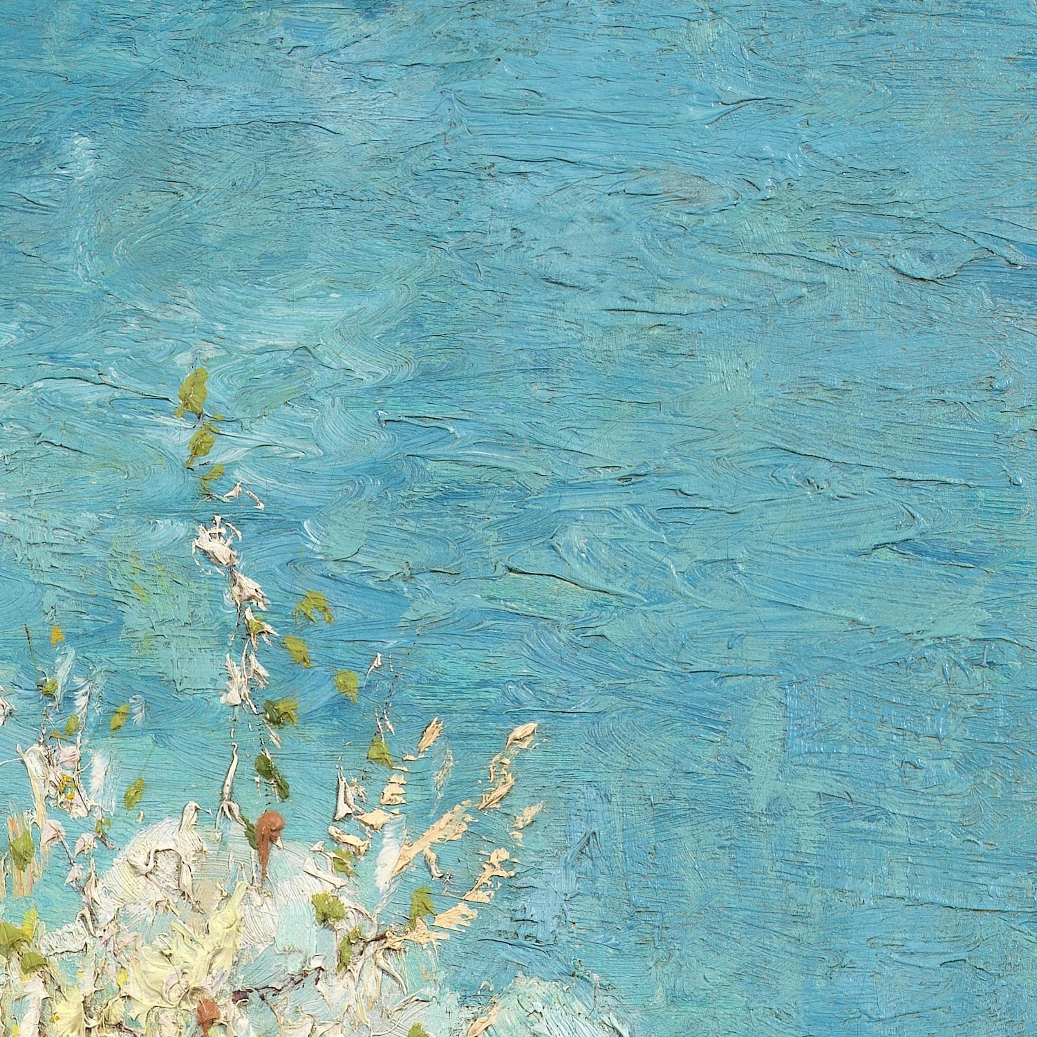 Color and touch carry the emotion. A radiant blue and white sky sets the stage for soft pinks and creamy whites of blossom, while cool greens and lilac-flecked earth knit foreground to horizon. Thick, impasto strokes catch the light, each mark alive with movement. Organic, dancing branches play against the gentle geometry of the fence and field, creating a rhythm that feels both deliberate and spontaneous. It’s a work that brightens a room not only with color but with energy—an ideal focal point above a sofa, in a dining area, or along a sunlit hallway.
