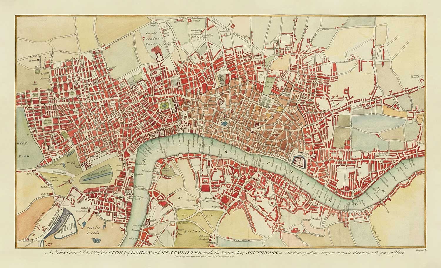 Many of the landmarks that would be laid down in the 19th century are missing - but many have already been erected in 1784, including St Paul's Cathedral, the British Museum, Tower of London, St James' Square (and what would become Buckingham Palace just down the road).