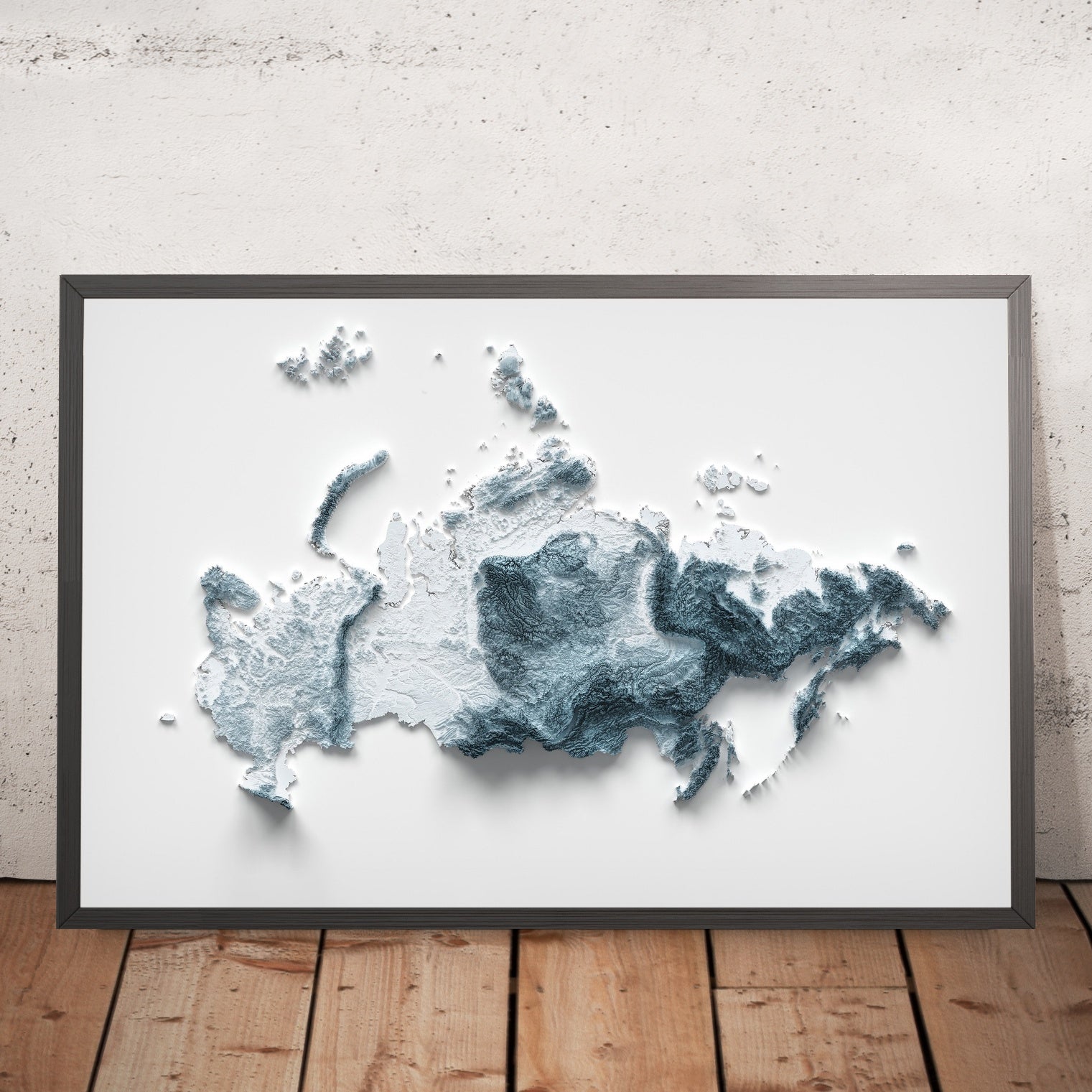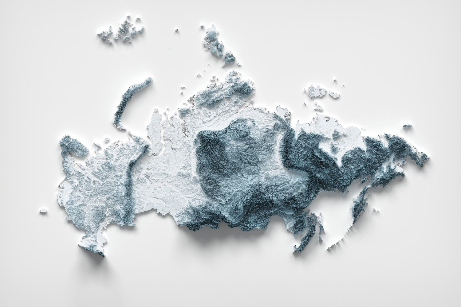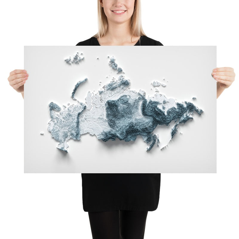 This is a minimalist topographical relief map of Russia, created by The Unique Maps Co. and enhanced with our trademarked Unique 3D process. There are no labels, no roads, and no towns — just the land itself, brought to life as light and shadow glide across peaks, plateaus and river basins. The contours are crisp, allowing you to read the country’s immense variety at a glance, from its European lowlands to its Pacific headlands.