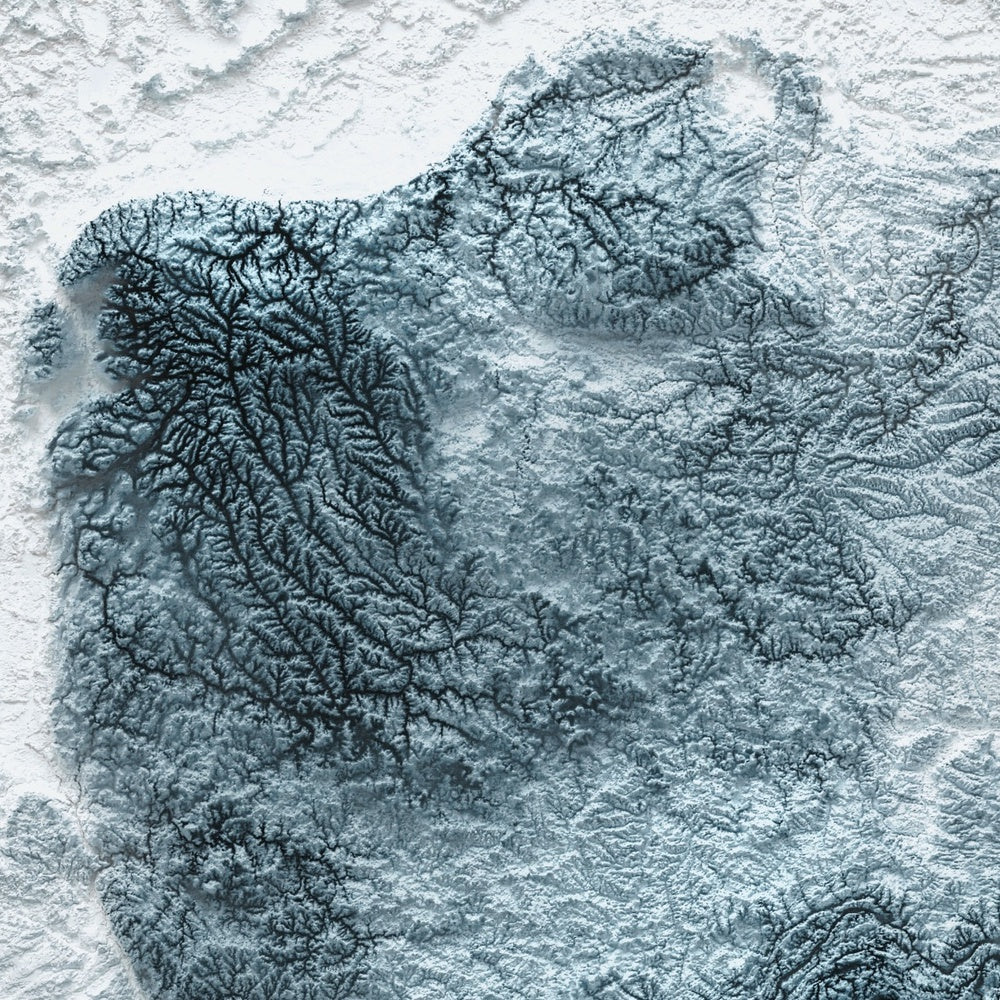 Our shaded relief prints use ultra high resolution topographic data and a secret 3D rendering process to create the illusion of raised terrain — like the mountains are about to lift right off the page. No labels, no borders, no distractions. Just the raw shape of the land, brought to life in a clean, modern style.