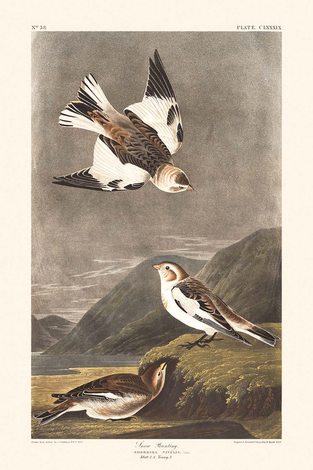 This artwork reflects Audubon’s distinctive style, where the Snow Bunting is depicted amidst the stark seasonal backdrop that forms part of its migratory narrative. The muted white feathers of the birds contrast with their ephemeral shadows on the winter-touched earth, emphasizing their struggle and harmony with nature’s cycles. The visual interaction between these birds, elegantly composed against a setting reminiscent of dawn's gentle light, showcases skillful use of color and perspective that brings depth and movement to the scene.