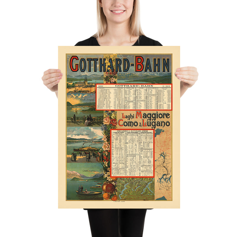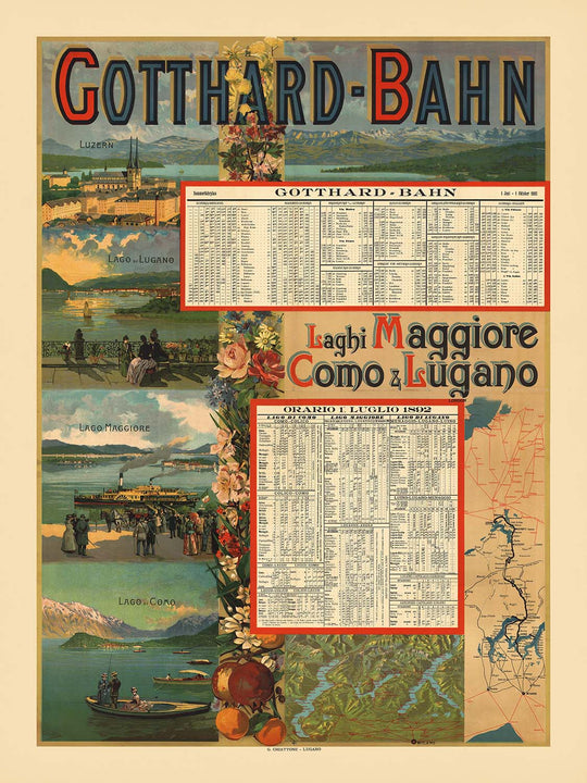 Why this subject matters: The Gotthard Railway was a marvel of its age, threading through the Alps to link German-speaking Switzerland with Ticino and onward to Italy. By the 1890s, rail made the lake district newly accessible to holidaymakers, who could step from panoramic carriages to promenades shaded by palms and camellias. This poster’s celebration of Lugano, Maggiore, and Como reflects that cultural crossroads—Swiss precision meeting Mediterranean light—and helped define the region’s image as a refined, international playground.