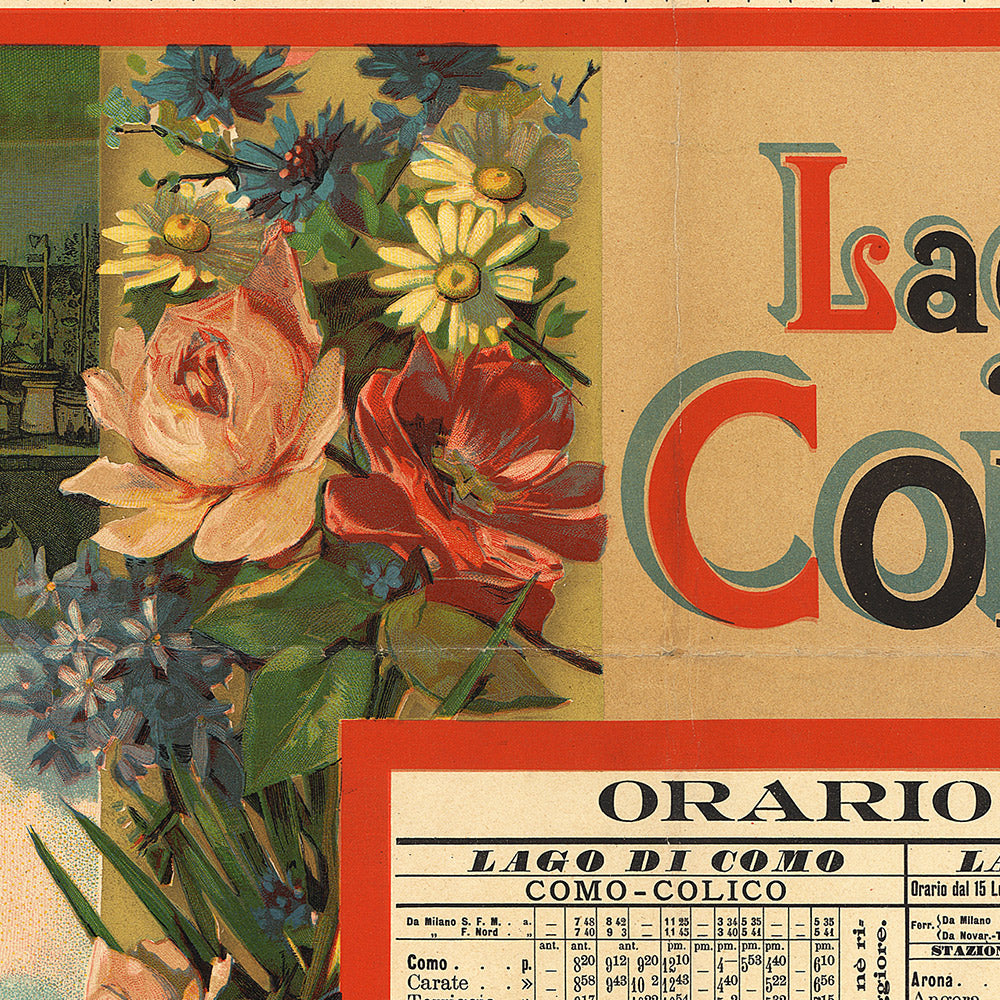 Design and color you’ll love: The palette shimmers with lake-blues and alpine greens, harmonized with warm, sunlit oranges and lively red accents that draw the eye to key details. Flowing, plant-inspired borders and sinuous silhouettes of mountains and shoreline evoke the natural rhythms of the landscape, while graceful lettering anchors the composition. A particularly charming period touch is the integration of practical travel information within the decorative framework—a hallmark of the era’s most sophisticated posters, where beauty and utility met on equal terms. The result is both historically resonant and strikingly contemporary on the wall.