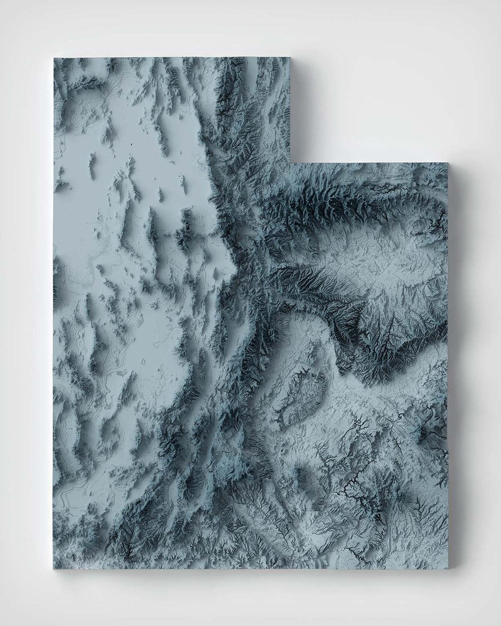 Utah, United States of America, is a land of dramatic contrasts and breathtaking grandeur—an icon of the American West immortalized in rugged relief. This map captures the striking variation of Utah’s geography, showcasing the interplay of light and shadow to reveal the towering Wasatch and Uinta Mountains, whose jagged ridgelines and high peaks slice through the upper reaches of the state. The effect is to bring each undulation and summit into vivid clarity, letting you trace the intricate folds and dramatic escarpments that shape Utah’s skyline.