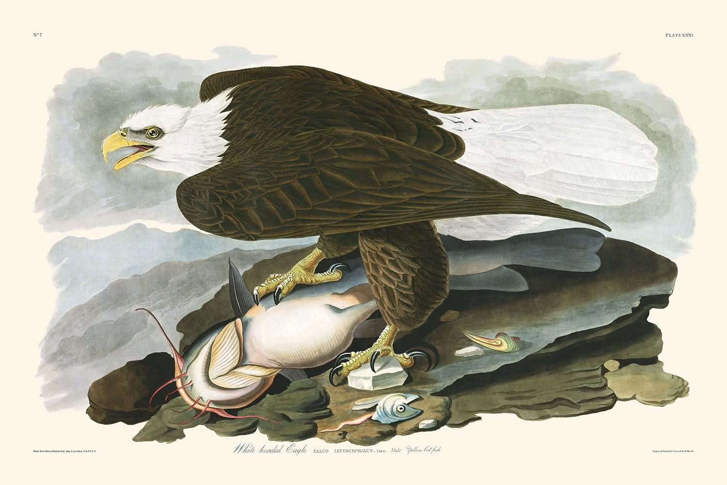 Audubon's dynamic use of color and composition in this piece brings to life the eagle's formidable elegance. The contrast between the stark white of the eagle’s head and the deep umber-brown of its feathers enhances its noble presence. This stunning portrayal is both a tribute to the eagle's majesty and an exquisite addition to any space, inspiring awe and admiration among viewers.